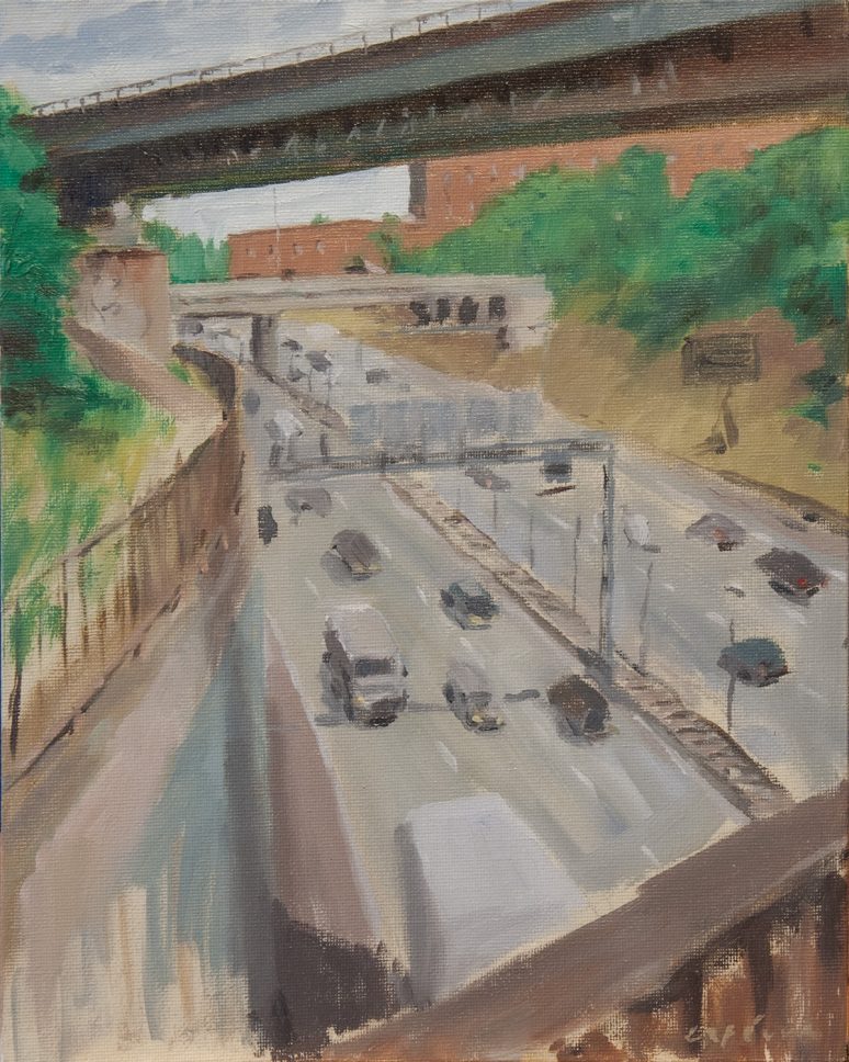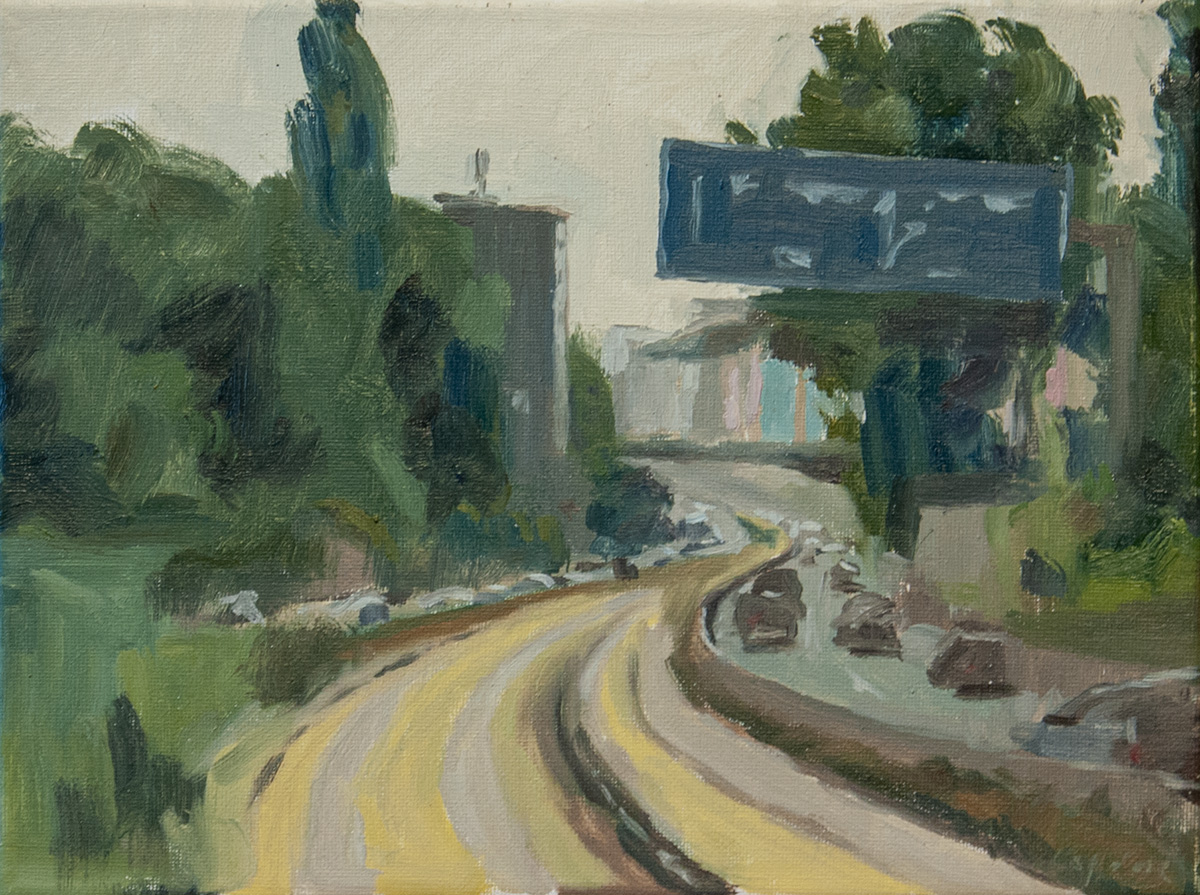 In this series of painting I represent the highway as a place that confronts us with the duality of freedom and restriction. The paintings depict people who try to escape the routine and expectations of society. I juxtapose these figurative scenes with still-life paintings of objects that signal a break or a crash of what’s to come.